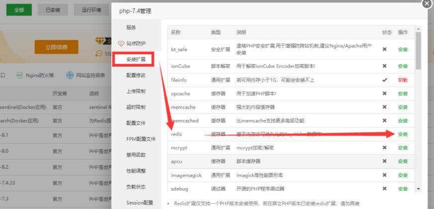 1、进入宝塔管理后台 >> 软件商店 >> 搜索redis,找到指定的php版本