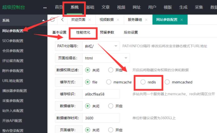 4、安装成功,进入苹果cms管理后台,系统 >> 网站参数配置 >> 性能优化 >> redis