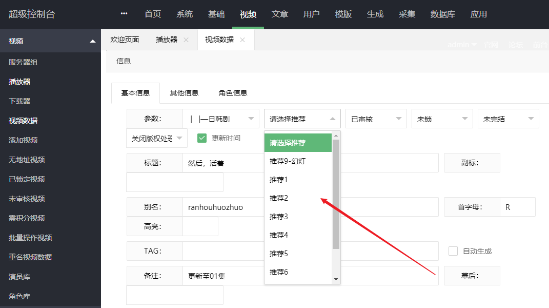 苹果cms设置幻灯轮播图片教程(图文) 作者: 无 • 更新时间:2025-11-18 •阅读 1、进入后台,找到你想设置的视频数据 2、设置推荐数,具体推荐几要看模板的调用写的是几,一般为5或是9 3、然后上传海报 本文采摘于网络,不代表本站立场,转载联系作者并注明出处:https://www.jsjds.com//pgjc/239.html