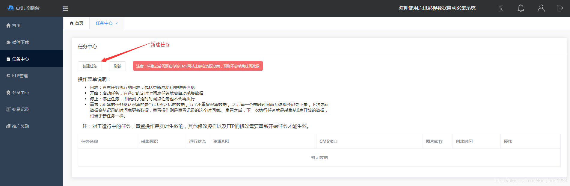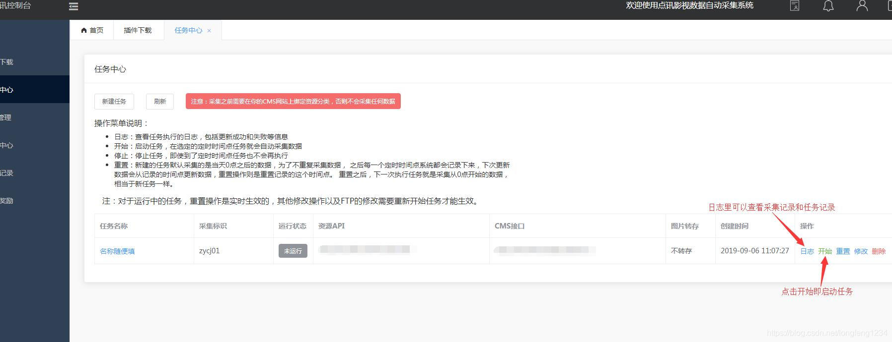 使用说明1、首先在你的CMS网站后台添加好资源库,并绑定好需要采集的分类任务预览