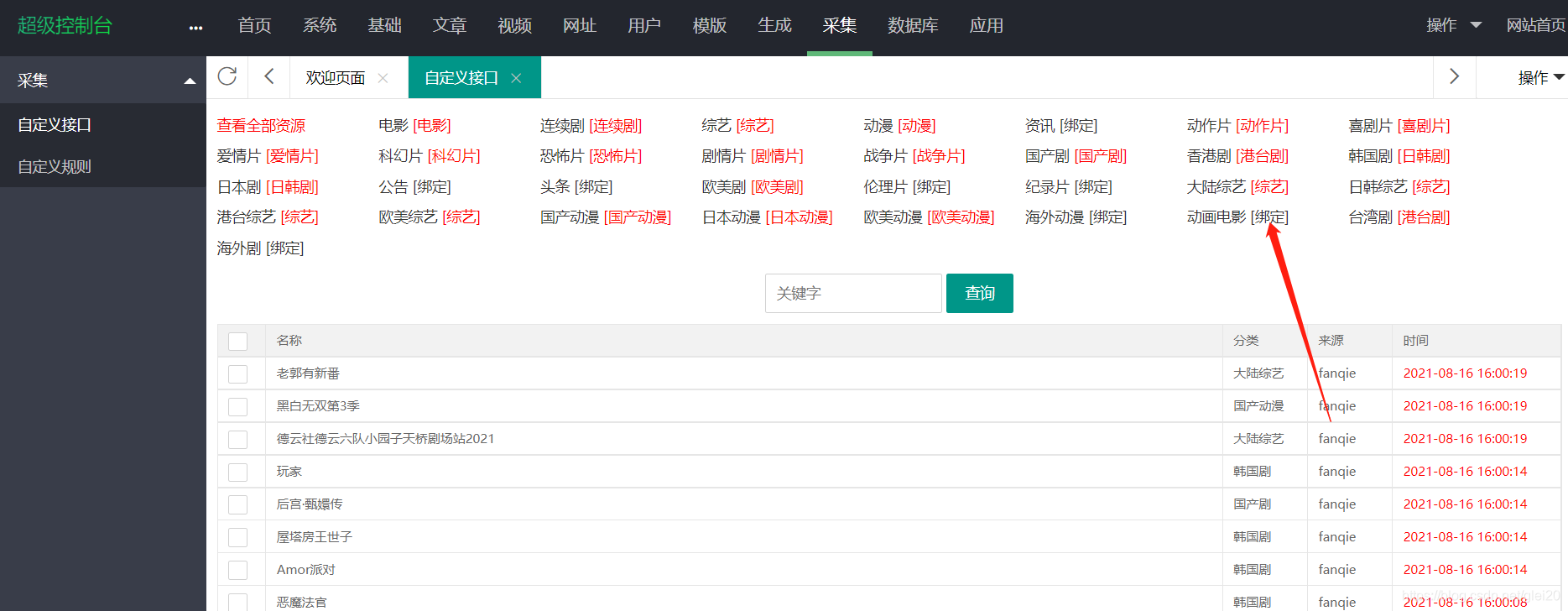 点击图片中的红框,进入数据页面,然后分类后面会有绑定,因为有些分类我已经绑定了,所以是红色的,没绑定的就点击绑定,然后给绑定到我们网站的分类中,如果没有对应的话,也可以在之前的海螺主题设置中添加分类
