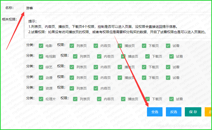 苹果cms提示没有权限解决方法 作者: 无 • 更新时间:2025-11-18 •阅读 1,提示权限不足这种情况是苹果cms新添加了分类,但是没有修改权限造成的。 2,解决办法:找到用户>>会员组>游客>编辑 3,修改游客权限,全部勾选后保存 本文采摘于网络,不代表本站立场,转载联系作者并注明出处:https://www.jsjds.com//pgjc/506.html