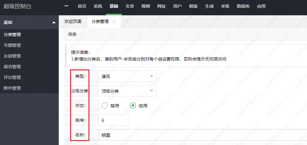 1,添加步骤和上面一样,只是填写的内容不一样,需要填写的内容根据下图红框后面的内容填写即可,填写完后记得保存。这样一个“明星”的子分类“大陆”栏目就添加成功了。