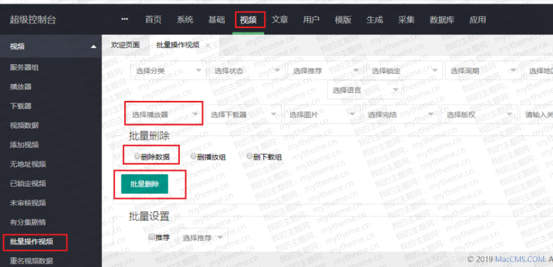 苹果cms系统后台>>视频>>批量操作视频>>选择状态框里选择已审核>>删除数据>>最后点击批量删除(完毕)