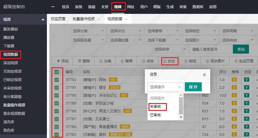 1,隐藏全部:视频->批量操作视频勾选状态,选择状态未审核,然后执行(这里是批量修改设置,也就是说,将所有视频,批量设置未审核达到隐藏状态)