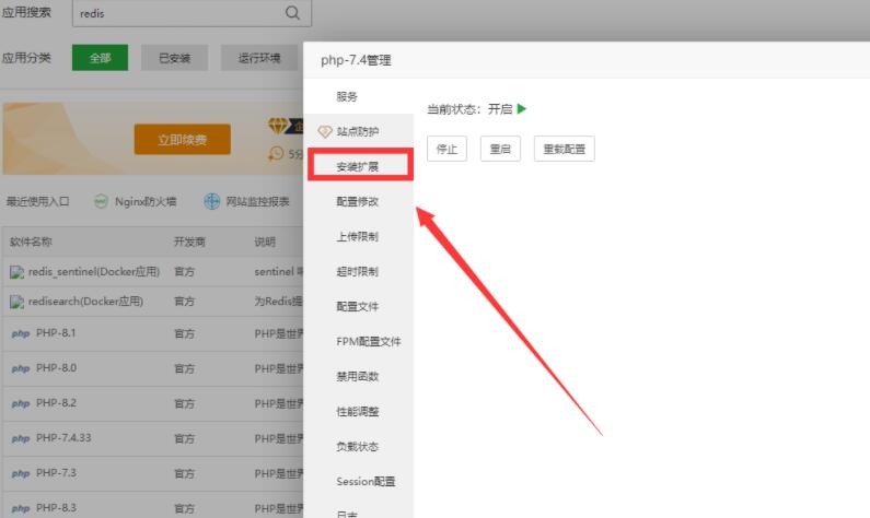1、进入宝塔管理后台 >> 软件商店 >> 搜索redis,找到指定的php版本