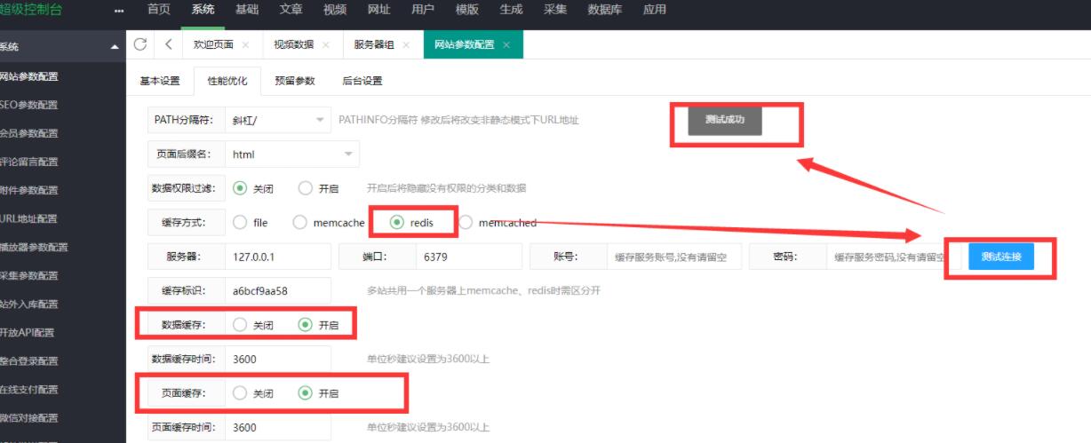 4、安装成功,进入苹果cms管理后台,系统 >> 网站参数配置 >> 性能优化 >> redis