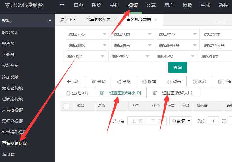 操作步骤:后台“视频”->“重名视频数据”然后选择“一键删重”,保留大ID或者小ID都可以,删除其他一个