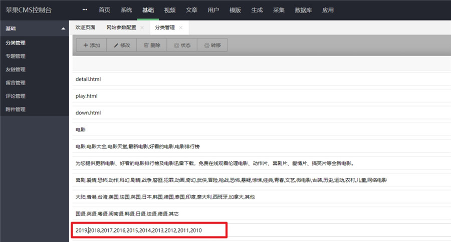 第二步:苹果CMS V10管理后台>>基础>>>分类管理>>>将【1:电影。2:电视剧。3:综艺。4:动漫】>>> 扩展年代>>> “2019,”逗号隔开(就是在2018,前面加上【2019,2020】保存即可。)