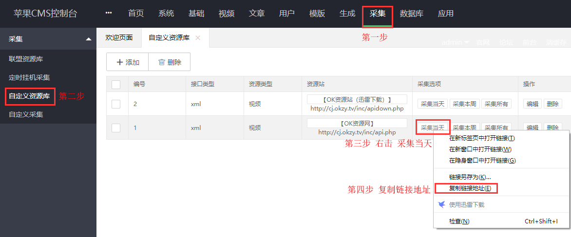 请按以下步骤进行:依次点击【采集】-【自定义资源库】-【添加】,在弹出的对话框中填写: