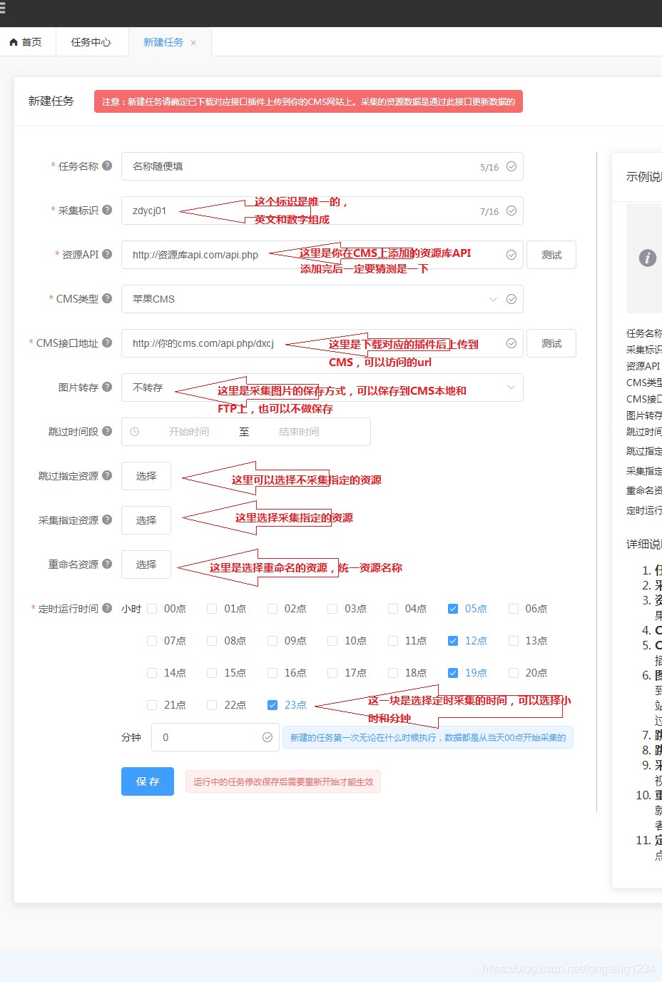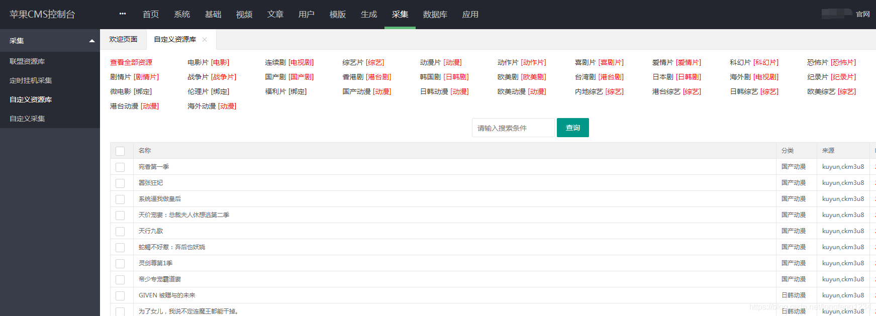 使用说明1、首先在你的CMS网站后台添加好资源库,并绑定好需要采集的分类任务预览